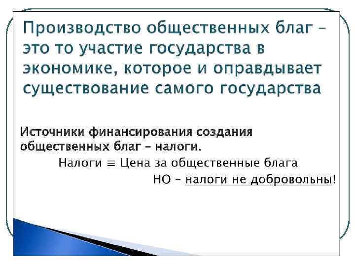 l l l Обеспечение общественных благ часто требует государственных действий. Чистое частное благо может эффективно распределить рынок. Следовательно, чистое частное благо приносит полезность только покупателю. Есть блага одновременно общественные и частные (услуги полиции, когда оказывается частная услуга конкретному лицу).