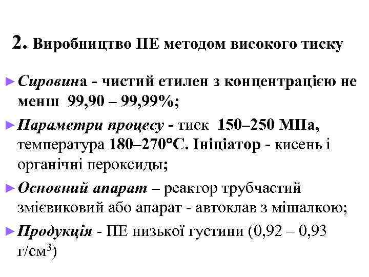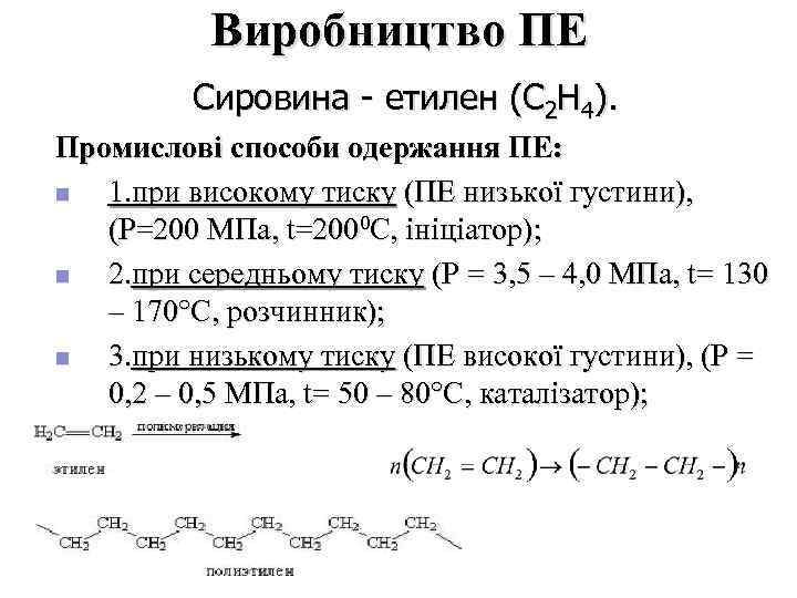 Виробництво ПЕ Сировина - етилен (С 2 Н 4). Промислові способи одержання ПЕ: n 1. при високому тиску (ПЕ низької густини), (Р=200 МПа, t=2000 C, ініціатор); n 2. при середньому тиску (P = 3, 5 – 4, 0 МПа, t= 130 – 170 C, розчинник); n 3. при низькому тиску (ПЕ високої густини), (P = 0, 2 – 0, 5 МПа, t= 50 – 80 C, каталізатор);