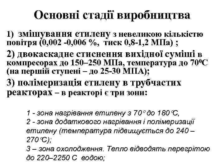Основні стадії виробництва 1) змішування етилену з невеликою кількістю повітря (0, 002 -0, 006 %, тиск 0, 8 -1, 2 МПа) ; 2) двокаскадне стиснення вихідної суміші в компресорах до 150– 250 МПа, температура до 700 С (на першій ступені – до 25 -30 МПА); 3) полімеризація етилену в трубчастих реакторах – в реакторі є три зони: 1 - зона нагрівання етилену з 70 до 180 С, 2 - зона додаткового нагрівання і полімеризації етилену (температура підвищується до 240 – 270 С); 3 – зона охолодження. Тепло відводять перегрітою до 220– 2250 С водою;