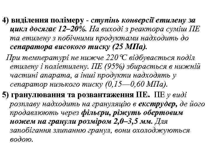4) виділення полімеру - ступінь конверсії етилену за цикл досягає 12– 20%. На виході з реактора суміш ПЕ та етилену з побічними продуктами надходить до сепаратора високого тиску (25 МПа). При температурі не нижче 220 С відбувається поділ етилену і поліетилену. ПЕ (95%) збирається в нижній частині апарата, а інші продукти надходять у сепаратор низького тиску (0, 15–– 0, 60 МПа). 5) гранулювання та розвантаження ПЕ. ПЕ у виді розплаву надходить на грануляцію в екструдер, де його продавлюють через фільєри, ріжуть обертовим ножем на гранули розміром 2, 0– 3, 5 мм. Для запобігання злипанню гранул, вони охолоджуються водою.