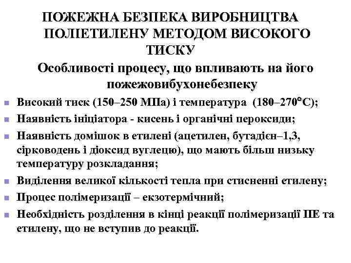 ПОЖЕЖНА БЕЗПЕКА ВИРОБНИЦТВА ПОЛІЕТИЛЕНУ МЕТОДОМ ВИСОКОГО ТИСКУ Особливості процесу, що впливають на його пожежовибухонебезпеку n Високий тиск (150– 250 МПа) і температура (180– 270 С); n Наявність ініціатора - кисень і органічні пероксиди; n Наявність домішок в етилені (ацетилен, бутадієн– 1, 3, сірководень і діоксид вуглецю), що мають більш низьку температуру розкладання; n Виділення великої кількості тепла при стисненні етилену; n Процес полімеризації – екзотермічний; n Необхідність розділення в кінці реакції полімеризації ПЕ та етилену, що не вступив до реакції.