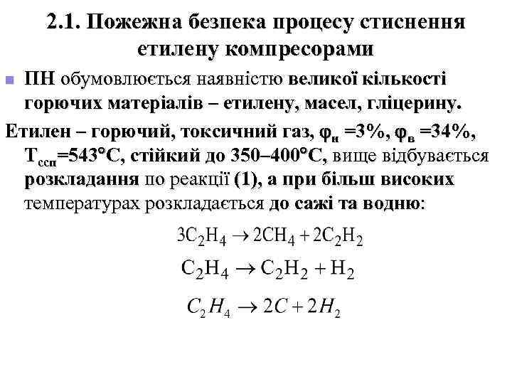 2. 1. Пожежна безпека процесу стиснення етилену компресорами n ПН обумовлюється наявністю великої кількості горючих матеріалів – етилену, масел, гліцерину. Етилен – горючий, токсичний газ, н =3%, в =34%, Тссп=543 С, стійкий до 350– 400 С, вище відбувається розкладання по реакції (1), а при більш високих температурах розкладається до сажі та водню: