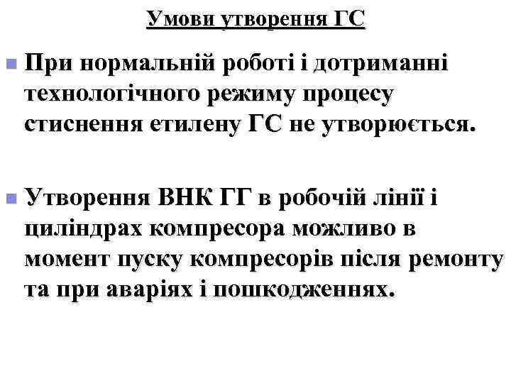 Умови утворення ГС n При нормальній роботі і дотриманні технологічного режиму процесу стиснення етилену ГС не утворюється. n Утворення ВНК ГГ в робочій лінії і циліндрах компресора можливо в момент пуску компресорів після ремонту та при аваріях і пошкодженнях.
