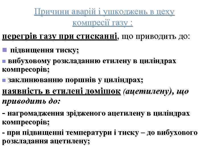 Причини аварій і ушкоджень в цеху компресії газу : перегрів газу при стисканні, що приводить до: n підвищення тиску; n вибуховому розкладанню етилену в циліндрах компресорів; n заклинюванню поршнів у циліндрах; наявність в етилені домішок (ацетилену), що приводить до: - нагромадження зрідженого ацетилену в циліндрах компресорів; - при підвищенні температури і тиску – до вибухового розкладання ацетилену;