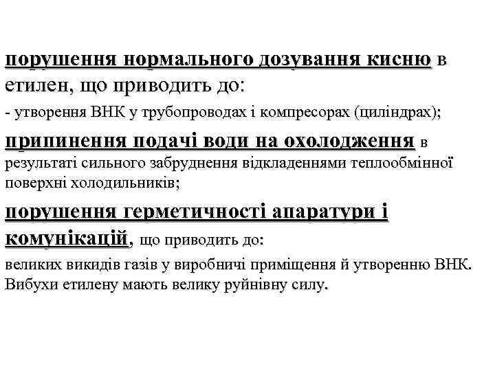 порушення нормального дозування кисню в етилен, що приводить до: - утворення ВНК у трубопроводах і компресорах (циліндрах); припинення подачі води на охолодження в результаті сильного забруднення відкладеннями теплообмінної поверхні холодильників; порушення герметичності апаратури і комунікацій, що приводить до: великих викидів газів у виробничі приміщення й утворенню ВНК. Вибухи етилену мають велику руйнівну силу.