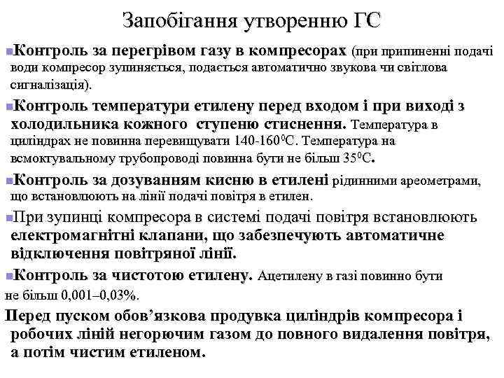 Запобігання утворенню ГС n. Контроль за перегрівом газу в компресорах (при припиненні подачі води компресор зупиняється, подається автоматично звукова чи світлова сигналізація). n. Контроль температури етилену перед входом і при виході з холодильника кожного ступеню стиснення. Температура в циліндрах не повинна перевищувати 140 -1600 С. Температура на всмоктувальному трубопроводі повинна бути не більш 350 С. n. Контроль за дозуванням кисню в етилені рідинними ареометрами, що встановлюють на лінії подачі повітря в етилен. n. При зупинці компресора в системі подачі повітря встановлюють електромагнітні клапани, що забезпечують автоматичне відключення повітряної лінії. n. Контроль за чистотою етилену. Ацетилену в газі повинно бути не більш 0, 001– 0, 03%. Перед пуском обов’язкова продувка циліндрів компресора і робочих ліній негорючим газом до повного видалення повітря, а потім чистим етиленом.