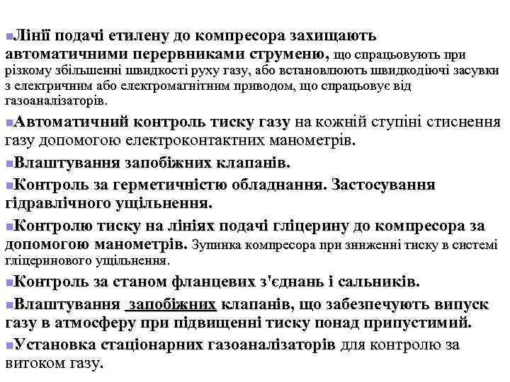 n. Лінії подачі етилену до компресора захищають автоматичними перервниками струменю, що спрацьовують при різкому збільшенні швидкості руху газу, або встановлюють швидкодіючі засувки з електричним або електромагнітним приводом, що спрацьовує від газоаналізаторів. n. Автоматичний контроль тиску газу на кожній ступіні стиснення газу допомогою електроконтактних манометрів. n. Влаштування запобіжних клапанів. n. Контроль за герметичністю обладнання. Застосування гідравлічного ущільнення. n. Контролю тиску на лініях подачі гліцерину до компресора за допомогою манометрів. Зупинка компресора при зниженні тиску в системі гліцеринового ущільнення. n. Контроль за станом фланцевих з'єднань і сальників. n. Влаштування запобіжних клапанів, що забезпечують випуск газу в атмосферу при підвищенні тиску понад припустимий. n. Установка стаціонарних газоаналізаторів для контролю за витоком газу.