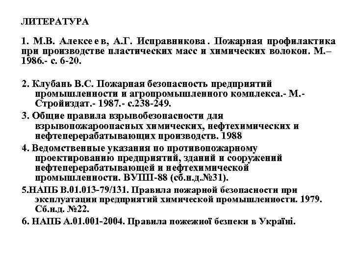ЛИТЕРАТУРА 1. М. В. Алексе е в, А. Г. Исправникова. Пожарная профилактика при производстве пластических масс и химических волокон. М. – 1986. - с. 6 -20. 2. Клубань В. С. Пожарная безопасность предприятий промышленности и агропромышленного комплекса. - М. - Стройиздат. - 1987. - с. 238 -249. 3. Общие правила взрывобезопасности для взрывопожароопасных химических, нефтехимических и нефтеперерабатывающих производств. 1988 4. Ведомственные указания по противопожарному проектированию предприятий, зданий и сооружений нефтеперерабатывающей и нефтехимической промышленности. ВУПП-88 (сб. н. д. № 31). 5. НАПБ В. 013 -79/131. Правила пожарной безопасности при эксплуатации предприятий химической промышленности. 1979. Сб. н. д. № 22. 6. НАПБ А. 01. 001 -2004. Правила пожежної безпеки в Україні.