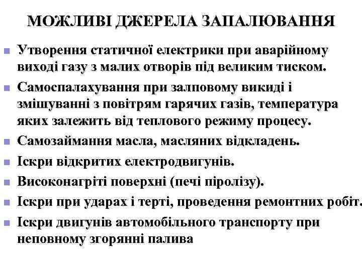 МОЖЛИВІ ДЖЕРЕЛА ЗАПАЛЮВАННЯ n Утворення статичної електрики при аварійному виході газу з малих отворів під великим тиском. n Самоспалахування при залповому викиді і змішуванні з повітрям гарячих газів, температура яких залежить від теплового режиму процесу. n Самозаймання масла, масляних відкладень. n Іскри відкритих електродвигунів. n Високонагріті поверхні (печі піролізу). n Іскри при ударах і терті, проведення ремонтних робіт. n Іскри двигунів автомобільного транспорту при неповному згорянні палива