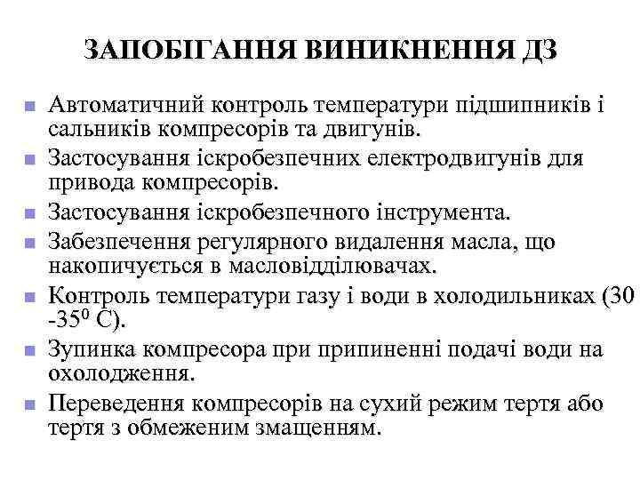 ЗАПОБІГАННЯ ВИНИКНЕННЯ ДЗ n Автоматичний контроль температури підшипників і сальників компресорів та двигунів. n Застосування іскробезпечних електродвигунів для привода компресорів. n Застосування іскробезпечного інструмента. n Забезпечення регулярного видалення масла, що накопичується в масловідділювачах. n Контроль температури газу і води в холодильниках (30 -350 С). n Зупинка компресора припиненні подачі води на охолодження. n Переведення компресорів на сухий режим тертя або тертя з обмеженим змащенням.
