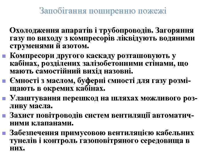 Запобігання поширенню пожежі Охолодження апаратів і трубопроводів. Загоряння газу по виходу з компресорів ліквідують водяними струменями й азотом. n Компресори другого каскаду розташовують у кабінах, розділених залізобетонними стінами, що мають самостійний вихід назовні. n Ємності з маслом, буферні ємності для газу розмі- щають в окремих кабінах. n Улаштування перешкод на шляхах можливого роз- ливу масла. n Захист повітроводів систем вентиляції автоматич- ними клапанами. n Забезпечення примусовою вентиляцією кабельних тунелів і контроль газоповітряного середовища в них.