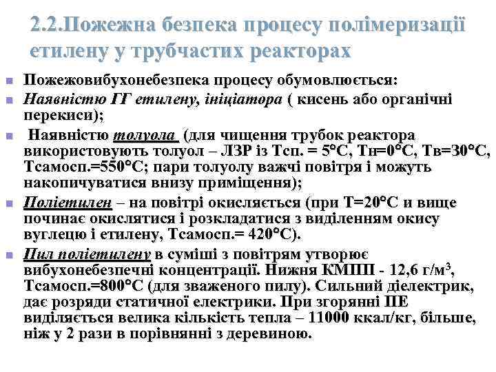 2. 2. Пожежна безпека процесу полімеризації етилену у трубчастих реакторах n Пожежовибухонебезпека процесу обумовлюється: n Наявністю ГГ етилену, ініціатора ( кисень або органічні перекиси); n Наявністю толуола (для чищення трубок реактора використовують толуол – ЛЗР із Тсп. = 5 С, Тн=0 С, Тв=З 0 С, Тсамосп. =550 С; пари толуолу важчі повітря і можуть накопичуватися внизу приміщення); n Поліетилен – на повітрі окисляється (при Т=20 С и вище починає окислятися і розкладатися з виділенням окису вуглецю і етилену, Тсамосп. = 420 С). n Пил поліетилену в суміші з повітрям утворює вибухонебезпечні концентрації. Нижня КМПП - 12, 6 г/м 3, Тсамосп. =800 С (для зваженого пилу). Сильний діелектрик, дає розряди статичної електрики. При згорянні ПЕ виділяється велика кількість тепла – 11000 ккал/кг, більше, ніж у 2 рази в порівнянні з деревиною.