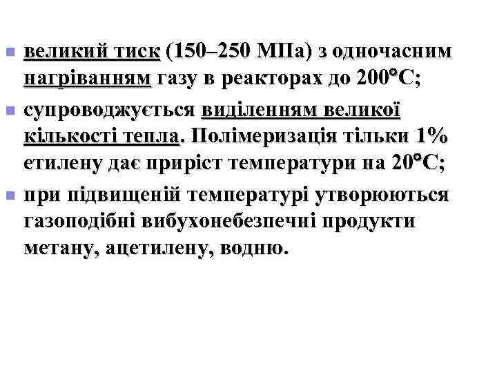n великий тиск (150– 250 МПа) з одночасним нагріванням газу в реакторах до 200 С; n супроводжується виділенням великої кількості тепла. Полімеризація тільки 1% етилену дає приріст температури на 20 С; n при підвищеній температурі утворюються газоподібні вибухонебезпечні продукти метану, ацетилену, водню.