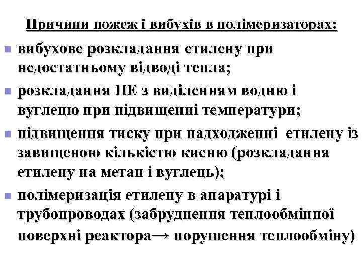 Причини пожеж і вибухів в полімеризаторах: n вибухове розкладання етилену при недостатньому відводі тепла; n розкладання ПЕ з виділенням водню і вуглецю при підвищенні температури; n підвищення тиску при надходженні етилену із завищеною кількістю кисню (розкладання етилену на метан і вуглець); n полімеризація етилену в апаратурі і трубопроводах (забруднення теплообмінної поверхні реактора→ порушення теплообміну)