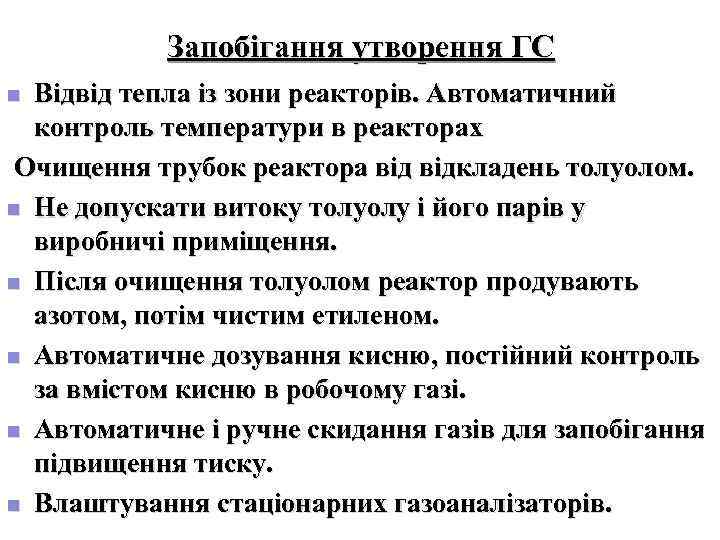 Запобігання утворення ГС n Відвід тепла із зони реакторів. Автоматичний контроль температури в реакторах Очищення трубок реактора відкладень толуолом. n Не допускати витоку толуолу і його парів у виробничі приміщення. n Після очищення толуолом реактор продувають азотом, потім чистим етиленом. n Автоматичне дозування кисню, постійний контроль за вмістом кисню в робочому газі. n Автоматичне і ручне скидання газів для запобігання підвищення тиску. n Влаштування стаціонарних газоаналізаторів.