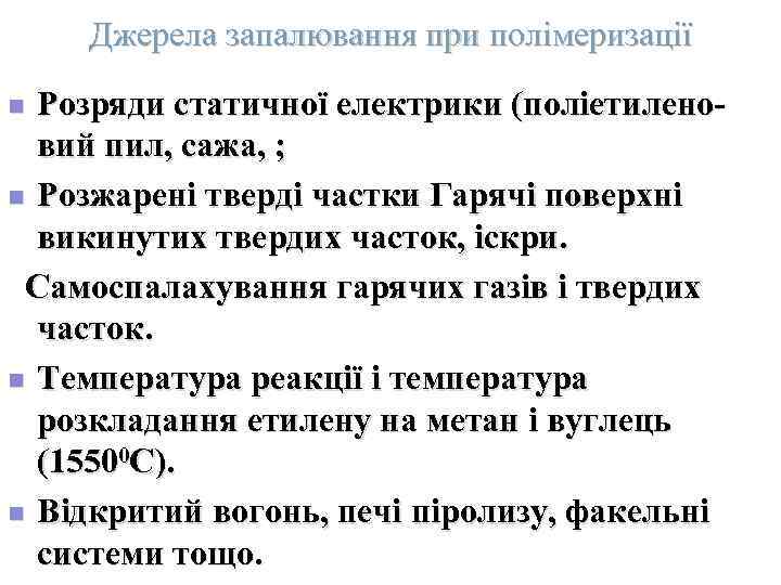 Джерела запалювання при полімеризації n Розряди статичної електрики (поліетилено- вий пил, сажа, ; n Розжарені тверді частки Гарячі поверхні викинутих твердих часток, іскри. Самоспалахування гарячих газів і твердих часток. n Температура реакції і температура розкладання етилену на метан і вуглець (15500 С). n Відкритий вогонь, печі піролизу, факельні системи тощо.