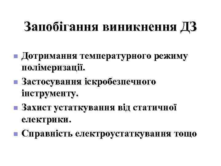 Запобігання виникнення ДЗ n Дотримання температурного режиму полімеризації. n Застосування іскробезпечного інструменту. n Захист устаткування від статичної електрики. n Справність електроустаткування тощо