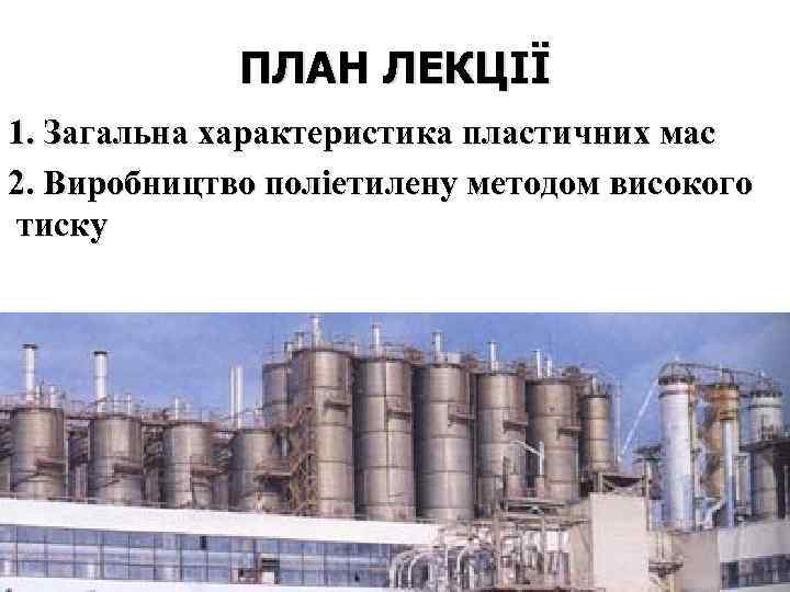 ПЛАН ЛЕКЦІЇ 1. Загальна характеристика пластичних мас 2. Виробництво поліетилену методом високого тиску
