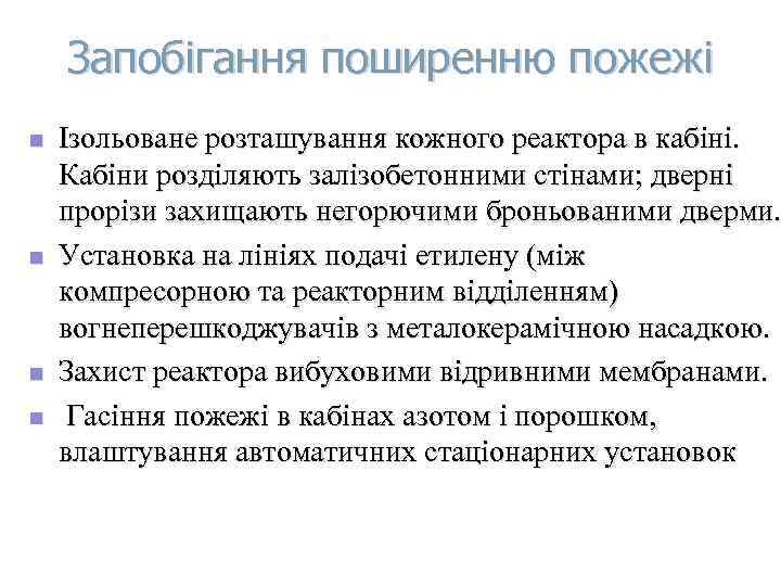 Запобігання поширенню пожежі n Ізольоване розташування кожного реактора в кабіні. Кабіни розділяють залізобетонними стінами; дверні прорізи захищають негорючими броньованими дверми. n Установка на лініях подачі етилену (між компресорною та реакторним відділенням) вогнеперешкоджувачів з металокерамічною насадкою. n Захист реактора вибуховими відривними мембранами. n Гасіння пожежі в кабінах азотом і порошком, влаштування автоматичних стаціонарних установок