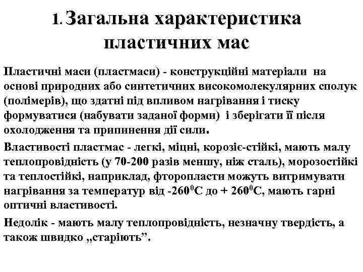 1. Загальна характеристика пластичних мас Пластичні маси (пластмаси) - конструкційні матеріали на основі природних або синтетичних високомолекулярних сполук (полімерів), що здатні під впливом нагрівання і тиску формуватися (набувати заданої форми) і зберігати її після охолодження та припинення дії сили. Властивості пластмас - легкі, міцні, корозіє-стійкі, мають малу теплопровідність (у 70 -200 разів меншу, ніж сталь), морозостійкі та теплостійкі, наприклад, фторопласти можуть витримувати нагрівання за температур від -2600 С до + 2600 С, мають гарні оптичні властивості. Недолік - мають малу теплопровідність, незначну твердість, а також швидко „старіють”.