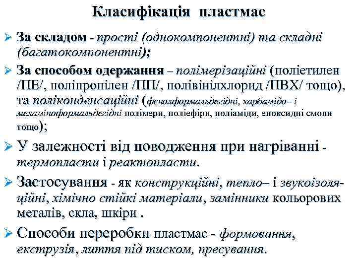 Класифікація пластмас Ø За складом - прості (однокомпонентні) та складні (багатокомпонентні); Ø За способом одержання – полімерізаційні (поліетилен /ПЕ/, поліпропілен /ПП/, полівінілхлорид /ПВХ/ тощо), та поліконденсаційні (фенолформальдегідні, карбамідо– і меламіноформальдегідні полімери, поліефіри, поліаміди, епоксидні смоли тощо); Ø У залежності від поводження при нагріванні - термопласти і реактопласти. Ø Застосування - як конструкційні, тепло– і звукоізоля- ційні, хімічно стійкі матеріали, замінники кольорових металів, скла, шкіри. Ø Способи переробки пластмас - формовання, екструзія, лиття під тиском, пресування.