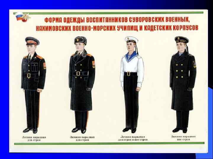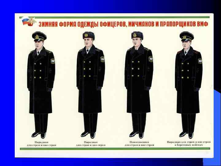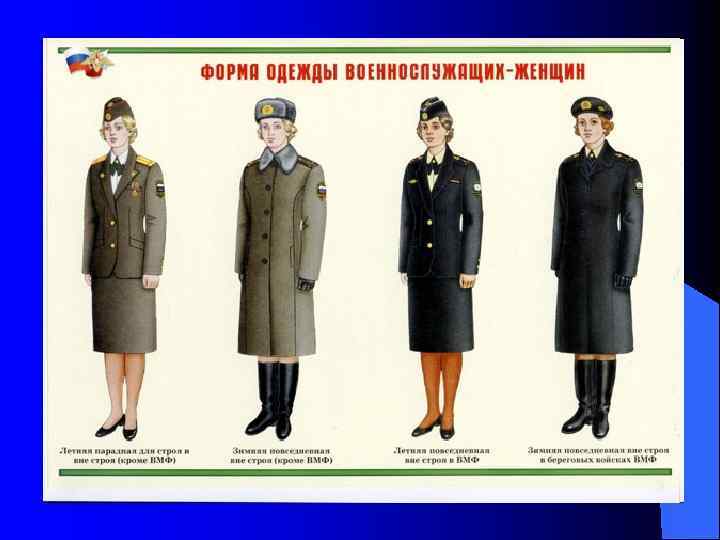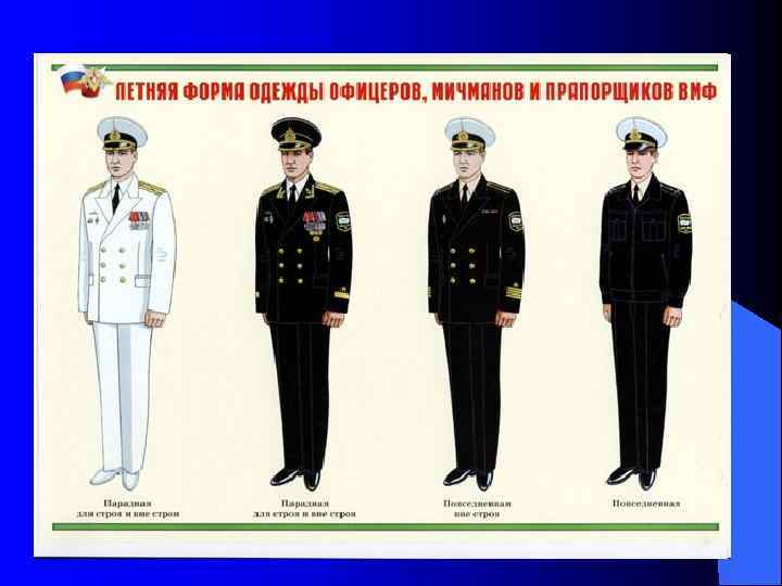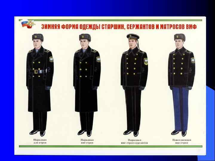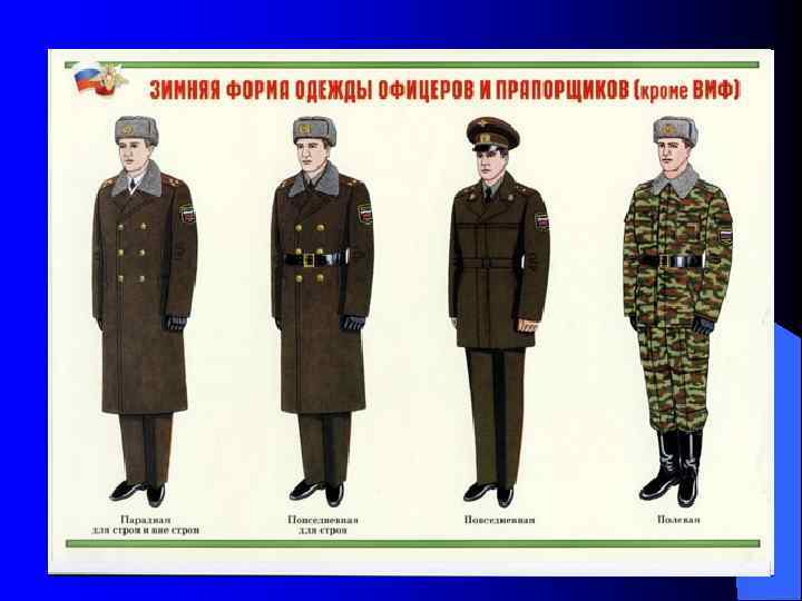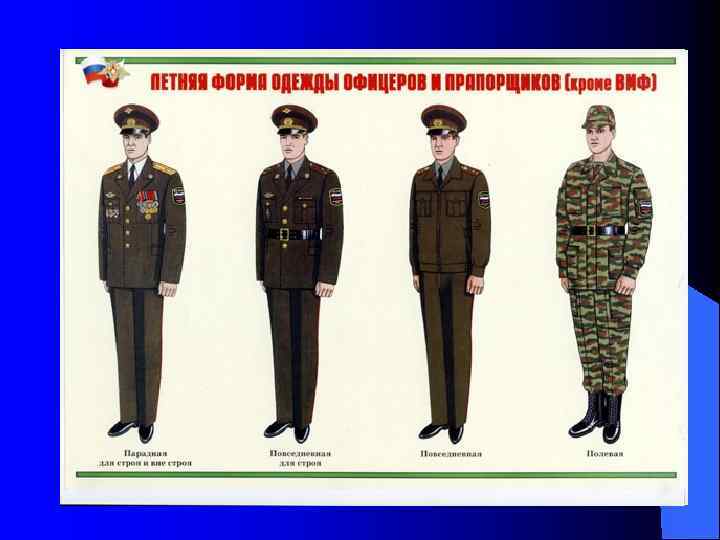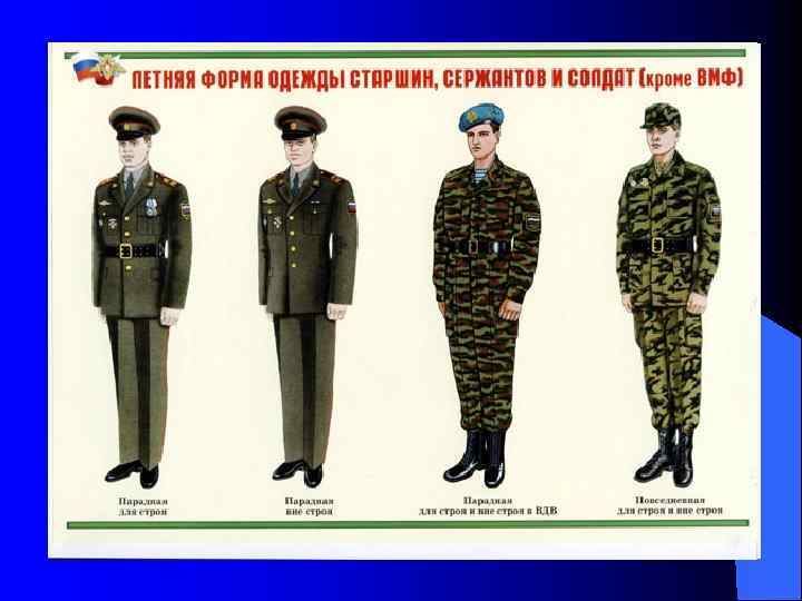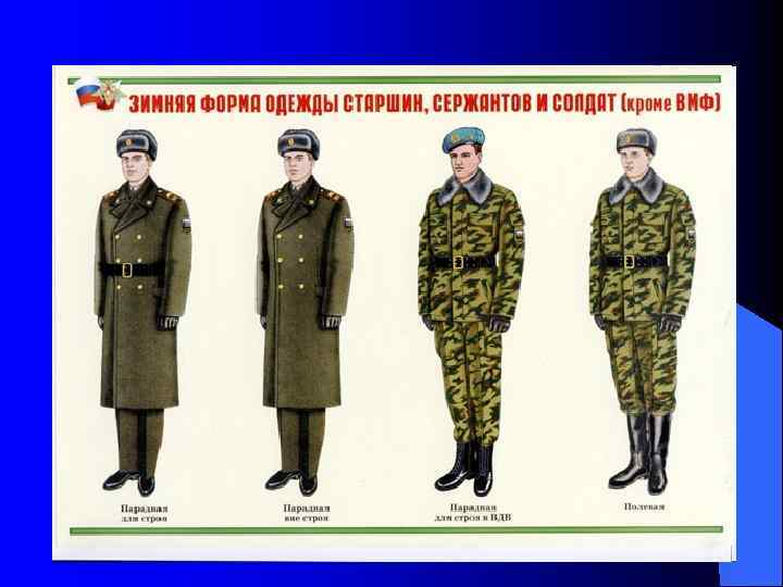Каждый военнослужащий обязан носить определенную форму одежды которые бывают: l Летняя l Зимняя l Парадно-выходная l Повседневная l Рабочая