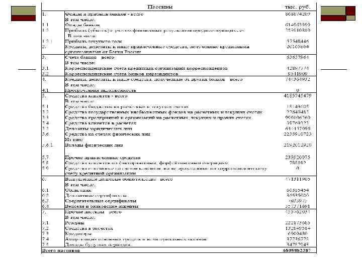 Активы - использование капитала oсобственность; o. Наличность (резервы); Пассивы - имеющийся в распоряжении денежный капитал oсобственный капитал; oсчета клиентов банка. oссуды; oценные бумаги. В России на 1. 01. 2010. Структура пассивов: собственный капитал – 15, 7%; счета организаций – 32, 5%; депозиты населения – 25, 4% и т. п. Структура активов: кредиты - 54, 8%, ценные бумаги – 14, 6% и т. п. . Кредиты составляют лишь 9, 4% инвестиций в основной капитал организаций всех форм собственности.