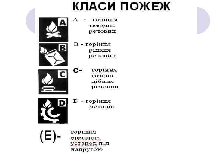 2. Класи пожеж та їх характеристики. l Клас А - Горіння твердих речовин ¡ ¡ А 1 - Горіння твердих речовин, що супроводжується тлінням (наприклад, дерева, паперу, соломи, вугілля, текстильних виробів) А 2 - Горіння твердих речовин, що не супроводжується тлінням (наприклад, пластмаси)