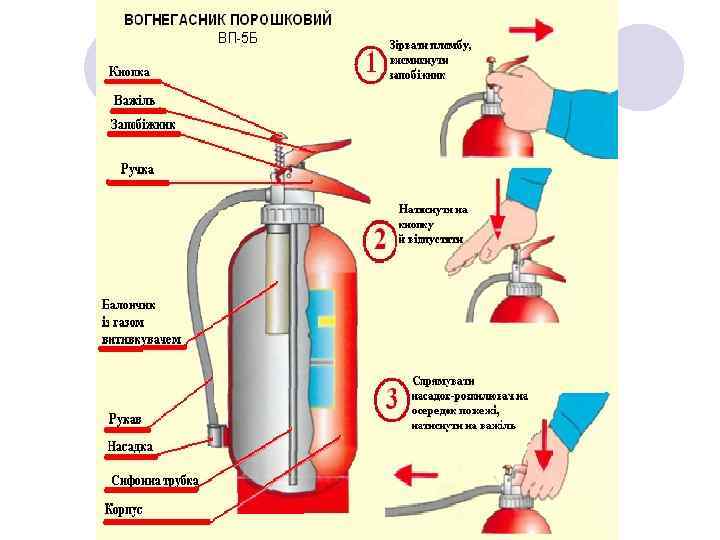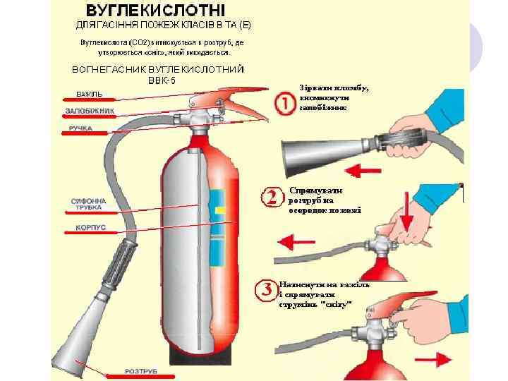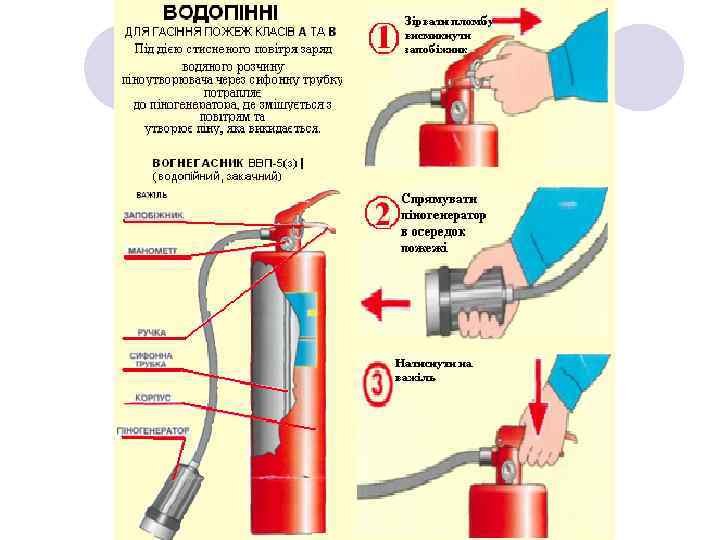 Правила безпеки праці при роботі з вогнегасниками. Забороняється при роботі з вогнегасниками: -роз’єднувати приєднувальні вузли, коли ствол і посудина з водою знаходяться під тиском; l-направляти ствол в сторону людей і електроустановок, які знаходяться ближче 10 метрів від оператора; l-відкривати пробку для заряджання водою, коли посудина знаходиться під тиском;