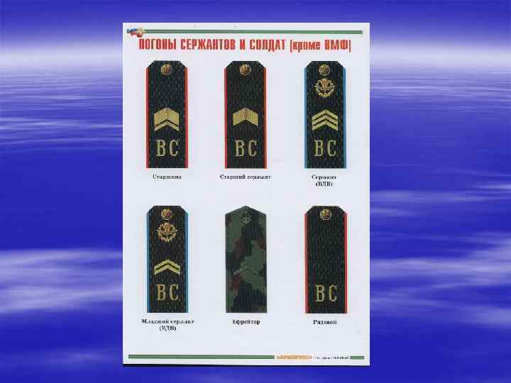 Общие обязанности военнослужащих: Военнослужащий обязан: § § § § § строго соблюдать Конституцию Российской Федерации и законы Российской Федерации, требования общевоинских уставов, беспрекословно выполнять приказы командиров (начальников); совершенствовать воинское мастерство, содержать в постоянной готовности к применению вооружение и военную технику, беречь военное имущество; быть дисциплинированным, бдительным, хранить государственную тайну; дорожить воинской честью и боевой славой Вооруженных Сил, своей воинской части, честью своего воинского звания и войсковым товариществом, с достоинством нести высокое звание защитника народа Российской Федерации; соблюдать общепризнанные принципы и нормы международного права и международные договоры Российской Федерации; быть честным, храбрым, при выполнении воинского долга проявлять разумную инициативу, защищать командиров (начальников) в бою, оберегать Боевое знамя воинской части; проявлять патриотизм, способствовать укреплению мира и дружбы между народами, предотвращению национальных и религиозных конфликтов; уважать честь и достоинство других военнослужащих, выручать их из опасности, помогать им словом и делом, удерживать от недостойных поступков, не допускать в отношении себя и других военнослужащих грубости и издевательства; содействовать командирам (начальникам) и старшим в поддержании порядка и дисциплины;