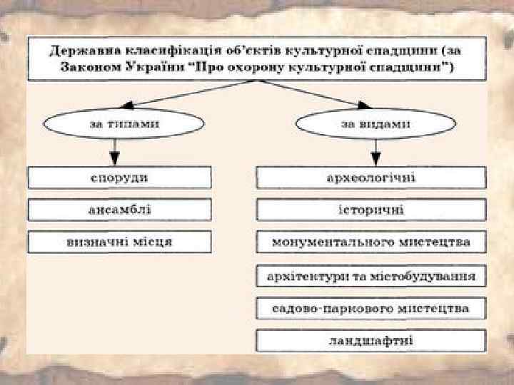 Культурна спадщина - сукупність успадкованих людством від попередніх поколінь об'єктів культурної спадщини Пам'ятка - об'єкт культурної спадщини національного або місцевого значення, який занесено до Державного реєстру нерухомих пам'яток України