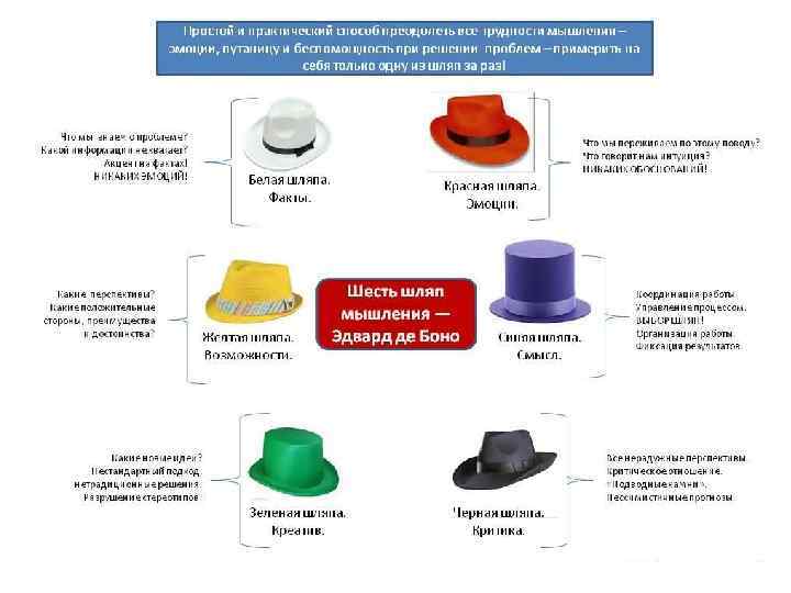 Мозговой штурм. Метод, применяемый для генерации и сбора разнообразных идей, связанных с требованиями к проекту и продукту. • Метод номинальных групп. В данном методе к мозговому штурму добавляется процесс голосования, используемый для ранжирования наиболее полезных идей для будущего мозгового штурма или расстановки приоритетов. • Метод Дельфи. Выбранная группа экспертов отвечает на вопросы анкет, а также высказывает мнение относительно ответов, полученных в течение каждого раунда сбора требований. Для обеспечения анонимности доступ к ответам имеет только координатор. • Составление интеллект-карт. Идеи, возникшие во время отдельных сессий мозгового штурма, объединяются в единой интеллект-карте с целью отражения сходства и различия в понимании и формирования новых идей. • 6 шляп мышления Эдварда де Боно