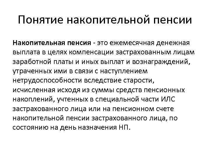Понятие накопительной пенсии Накопительная пенсия - это ежемесячная денежная выплата в целях компенсации застрахованным лицам заработной платы и иных выплат и вознаграждений, утраченных ими в связи с наступлением нетрудоспособности вследствие старости, исчисленная исходя из суммы средств пенсионных накоплений, учтенных в специальной части ИЛС застрахованного лица или на пенсионном счете накопительной пенсии застрахованного лица, по состоянию на день назначения НП.