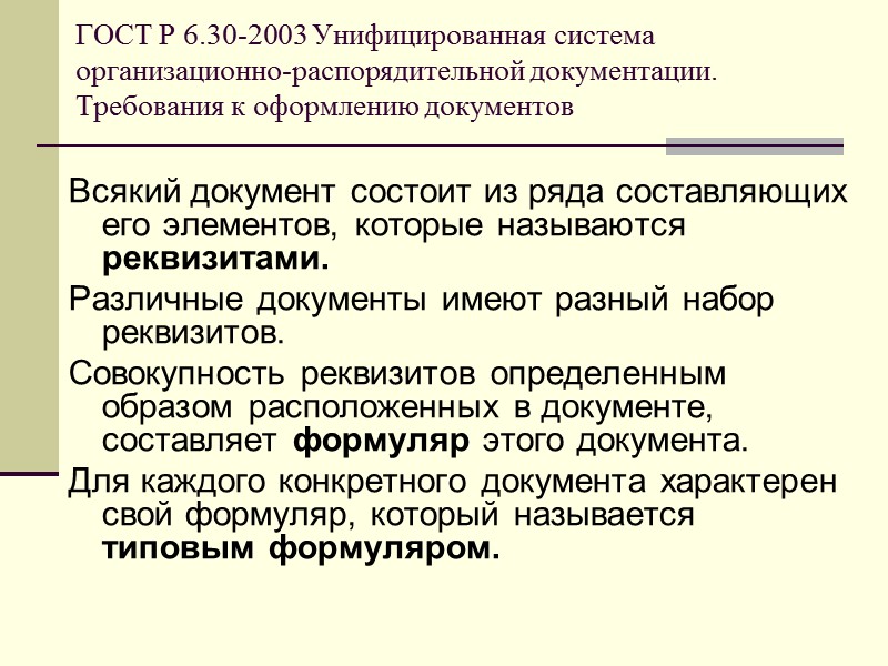 ГОСТ Р 6.30-2003 Унифицированная система организационно-распорядительной документации. Требования к оформлению документов Всякий документ состоит из ряда составляющих его элементов, которые называются реквизитами. Различные документы имеют разный набор реквизитов. Совокупность реквизитов определенным образом расположенных в документе, составляет формуляр этого документа. Для каждого конкретного документа характерен свой формуляр, который называется типовым формуляром.