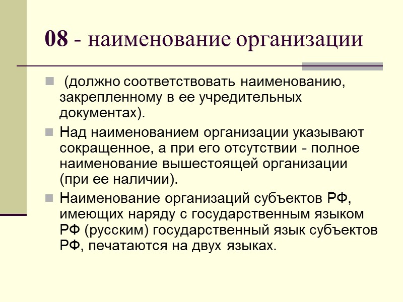 08 - наименование организации (должно соответствовать наименованию, закрепленному в ее учредительных документах). Над наименованием организации указывают сокращенное, а при его отсутствии - полное наименование вышестоящей организации (при ее наличии). Наименование организаций субъектов РФ, имеющих наряду с государственным языком РФ (русским) государственный язык субъектов РФ, печатаются на двух языках.