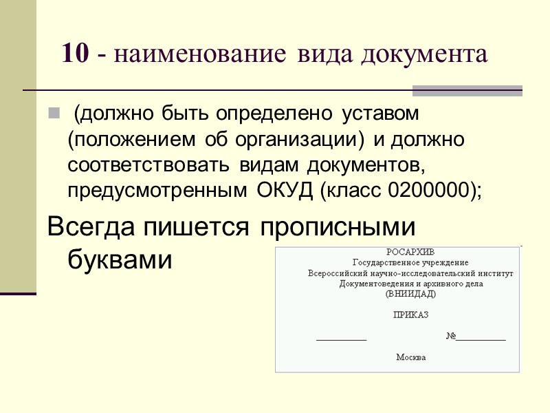 10 - наименование вида документа (должно быть определено уставом (положением об организации) и должно соответствовать видам документов, предусмотренным ОКУД (класс 0200000); Всегда пишется прописными буквами
