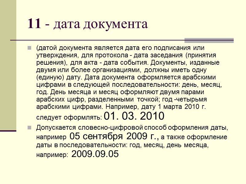 11 - дата документа (датой документа является дата его подписания или утверждения, для протокола - дата заседания (принятия решения), для акта - дата события. Документы, изданные двумя или более организациями, должны иметь одну (единую) дату. Дата документа оформляется арабскими цифрами в следующей последовательности: день, месяц, год. День месяца и месяц оформляют двумя парами арабских цифр, разделенными точкой; год -четырьмя арабскими цифрами. Например, дату 1 марта 2010 г. следует оформлять: 01. 03. 2010 Допускается словесно-цифровой способ оформления даты, например 05 сентября 2009 г., а также оформление даты в последовательности: год, месяц, день месяца, например: 2009.09.05