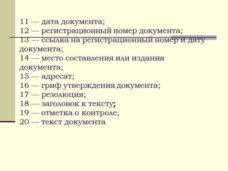 11 — дата документа; 12 — регистрационный номер документа; 13 — ссылка на регистрационный номер и дату документа; 14 — место составления или издания документа; 15 — адресат; 16 — гриф утверждения документа; 17 — резолюция; 18 — заголовок к тексту; 19 — отметка о контроле; 20 — текст документа ;