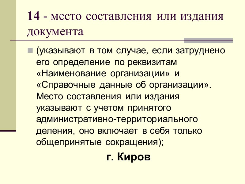 14 - место составления или издания документа (указывают в том случае, если затруднено его определение по реквизитам «Наименование организации» и «Справочные данные об организации». Место составления или издания указывают с учетом принятого административно-территориального деления, оно включает в себя только общепринятые сокращения); г. Киров