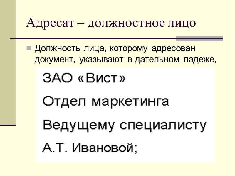 Адресат – должностное лицо Должность лица, которому адресован документ, указывают в дательном падеже,