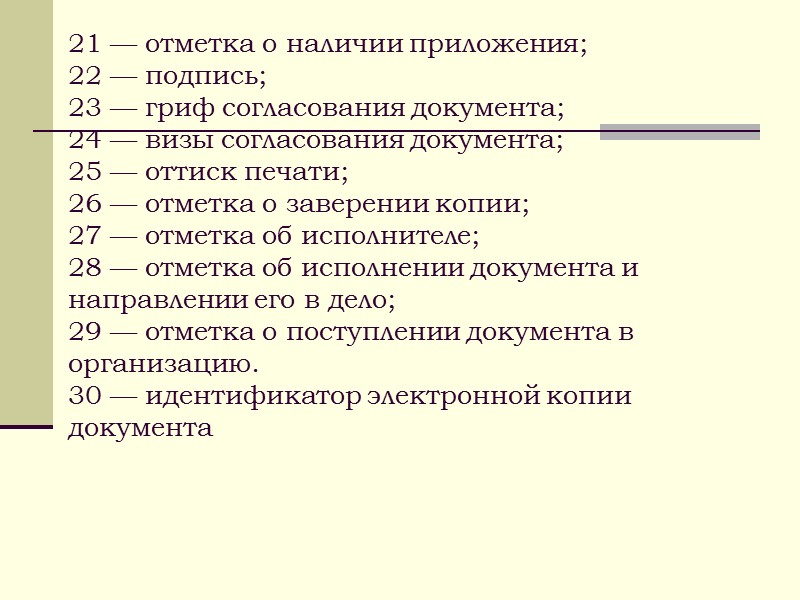 21 — отметка о наличии приложения; 22 — подпись; 23 — гриф согласования документа; 24 — визы согласования документа; 25 — оттиск печати; 26 — отметка о заверении копии; 27 — отметка об исполнителе; 28 — отметка об исполнении документа и направлении его в дело; 29 — отметка о поступлении документа в организацию. 30 — идентификатор электронной копии документа