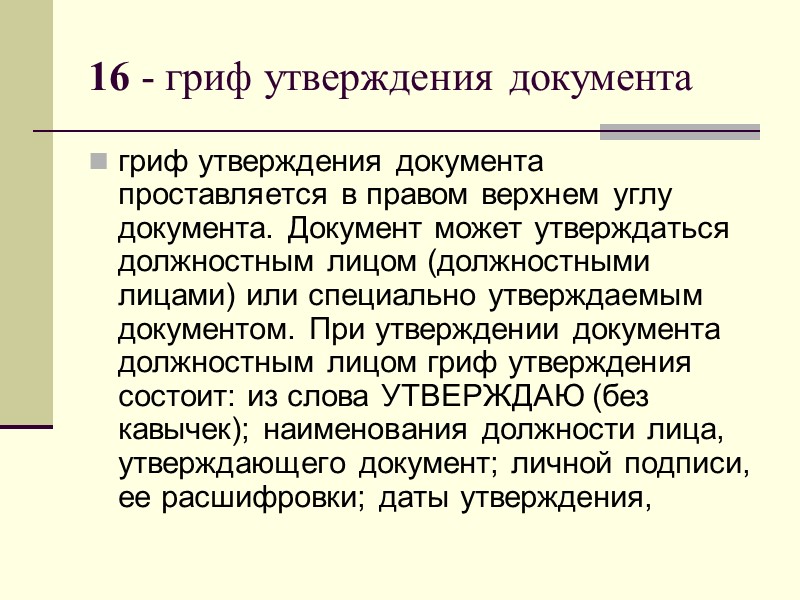 16 - гриф утверждения документа гриф утверждения документа проставляется в правом верхнем углу документа. Документ может утверждаться должностным лицом (должностными лицами) или специально утверждаемым документом. При утверждении документа должностным лицом гриф утверждения состоит: из слова УТВЕРЖДАЮ (без кавычек); наименования должности лица, утверждающего документ; личной подписи, ее расшифровки; даты утверждения,