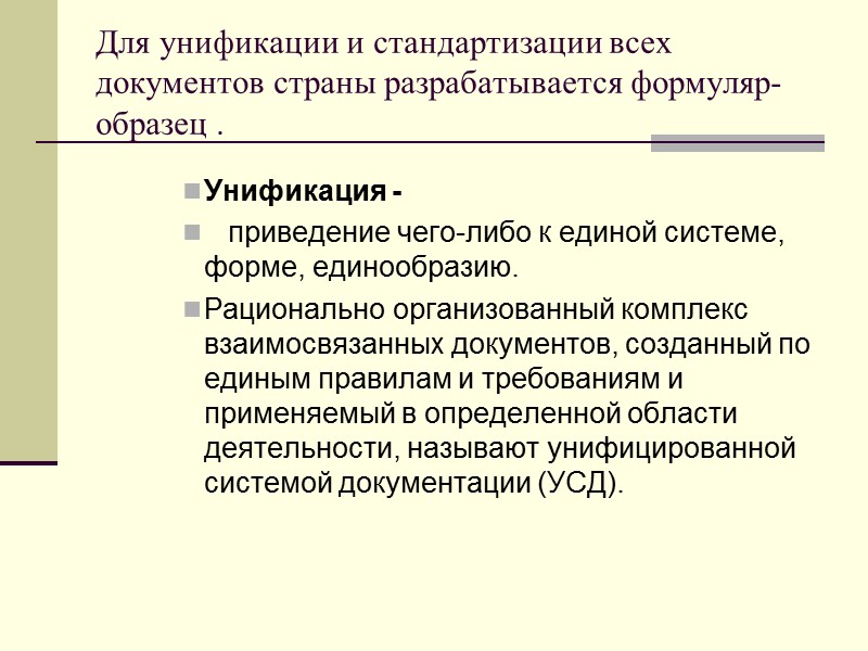 Для унификации и стандартизации всех документов страны разрабатывается формуляр-образец . Унификация - приведение чего-либо к единой системе, форме, единообразию. Рационально организованный комплекс взаимосвязанных документов, созданный по единым правилам и требованиям и применяемый в определенной области деятельности, называют унифицированной системой документации (УСД).