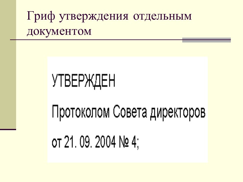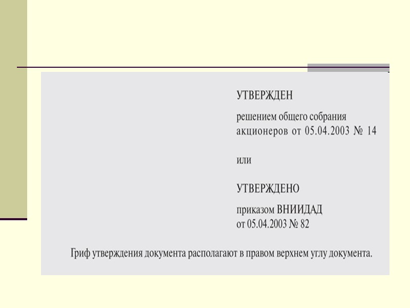 Гриф утверждения При утверждении документа постановлением, решением, приказом, протоколом гриф утверждения включает: слово УТВЕРЖДЕН (без кавычек); наименование утверждающего документа в творительном падеже; дату и номер утверждающего документа,