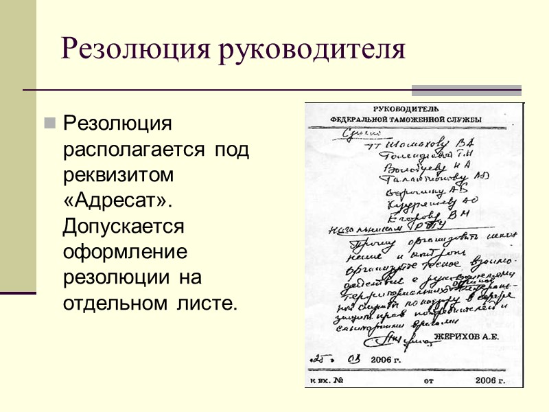 Резолюция руководителя Резолюция располагается под реквизитом «Адресат». Допускается оформление резолюции на отдельном листе.