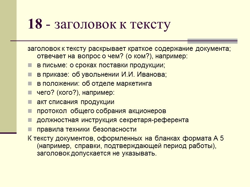 18 - заголовок к тексту заголовок к тексту раскрывает краткое содержание документа; отвечает на вопрос о чем? (о ком?), например: в письме: о сроках поставки продукции; в приказе: об увольнении И.И. Иванова; в положении: об отделе маркетинга чего? (кого?), например: акт списания продукции протокол общего собрания акционеров должностная инструкция секретаря-референта правила техники безопасности К тексту документов, оформленных на бланках формата А 5 (например, справки, подтверждающей период работы), заголовок допускается не указывать.
