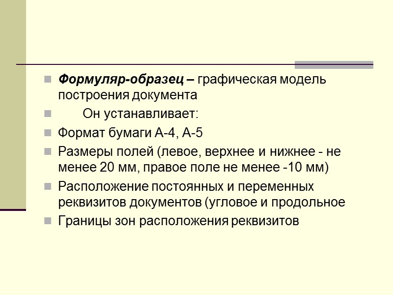 Формуляр-образец – графическая модель построения документа Он устанавливает: Формат бумаги А-4, А-5 Размеры полей (левое, верхнее и нижнее - не менее 20 мм, правое поле не менее -10 мм) Расположение постоянных и переменных реквизитов документов (угловое и продольное Границы зон расположения реквизитов