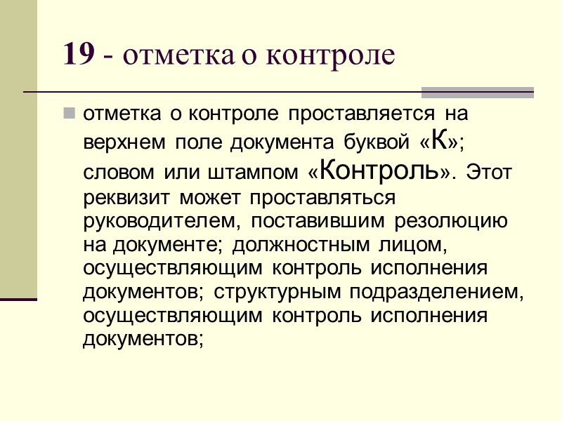 19 - отметка о контроле отметка о контроле проставляется на верхнем поле документа буквой «К»; словом или штампом «Контроль». Этот реквизит может проставляться руководителем, поставившим резолюцию на документе; должностным лицом, осуществляющим контроль исполнения документов; структурным подразделением, осуществляющим контроль исполнения документов;