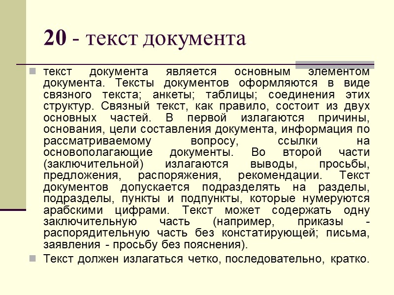 20 - текст документа текст документа является основным элементом документа. Тексты документов оформляются в виде связного текста; анкеты; таблицы; соединения этих структур. Связный текст, как правило, состоит из двух основных частей. В первой излагаются причины, основания, цели составления документа, информация по рассматриваемому вопросу, ссылки на основополагающие документы. Во второй части (заключительной) излагаются выводы, просьбы, предложения, распоряжения, рекомендации. Текст документов допускается подразделять на разделы, подразделы, пункты и подпункты, которые нумеруются арабскими цифрами. Текст может содержать одну заключительную часть (например, приказы - распорядительную часть без констатирующей; письма, заявления - просьбу без пояснения). Текст должен излагаться четко, последовательно, кратко.