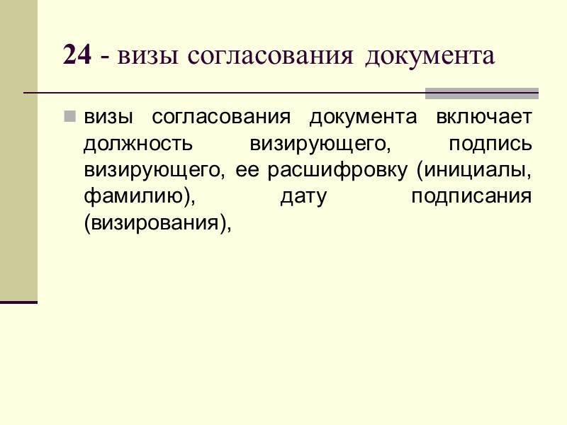 24 - визы согласования документа визы согласования документа включает должность визирующего, подпись визирующего, ее расшифровку (инициалы, фамилию), дату подписания (визирования),